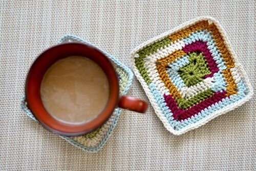 先日からかぎ針編みを始めて います。 大物のブランケットを編むかたわら、 気分転換にコースターなんか 編んでます。 グラニースクエアーって編み方です。 編み方はチョー簡単なので 配色に凝ってます。 ま、遊び心ですよ(笑 以前は、 毛糸の太さは並太が…